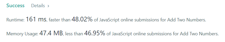 return (l1 || l2 || carry) ? { val, next: add(l1 && l1.next, l2 && l2.next, newCarry) } : null;