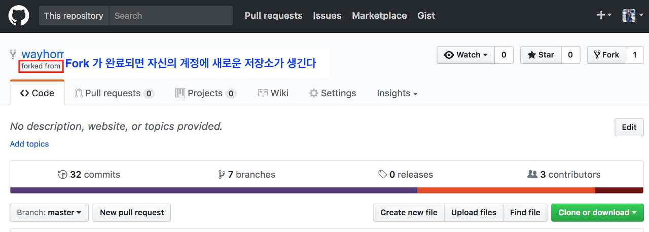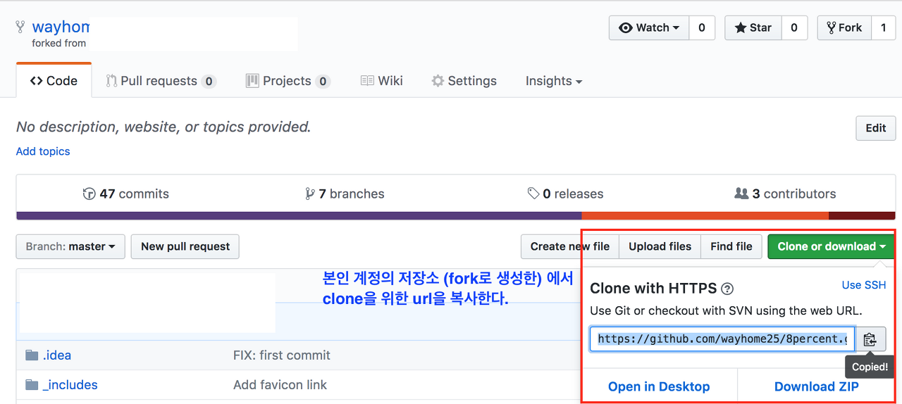 - 자신의 컴퓨터에서 작업을 하기 위해서 Fork한 저장소를 로컬에 clone 한다.