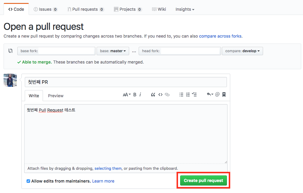 - 해당 버튼을 선택하여 메시지를 작성하고 PR을 생성한다.