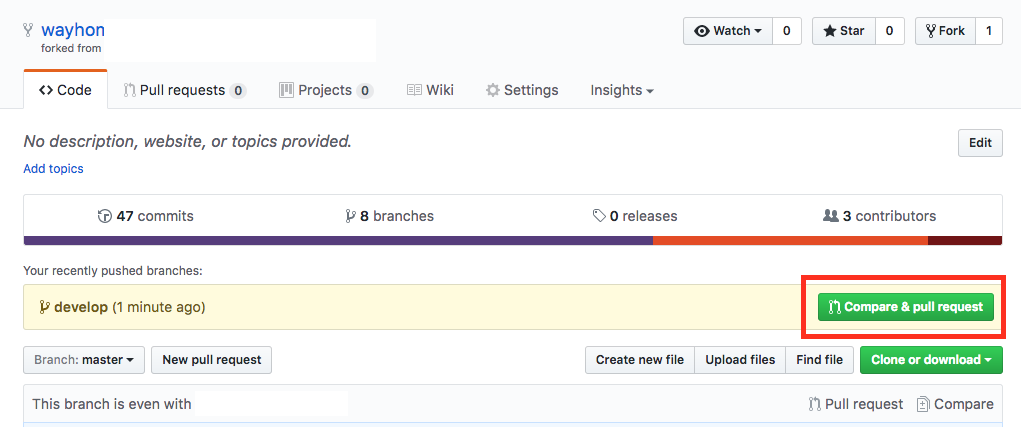 - push 완료 후 본인 계정의 github 저장소에 들어오면 Compare & pull reqeust 버튼이 활성화 되어 있다.