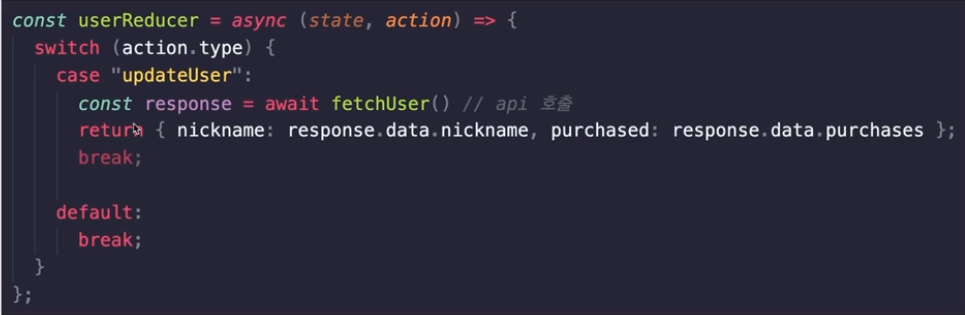 다른 미들웨어를 사용하지 않아도 비동기 통신 후에 전역 상태를 업데이트 할 수 있다.