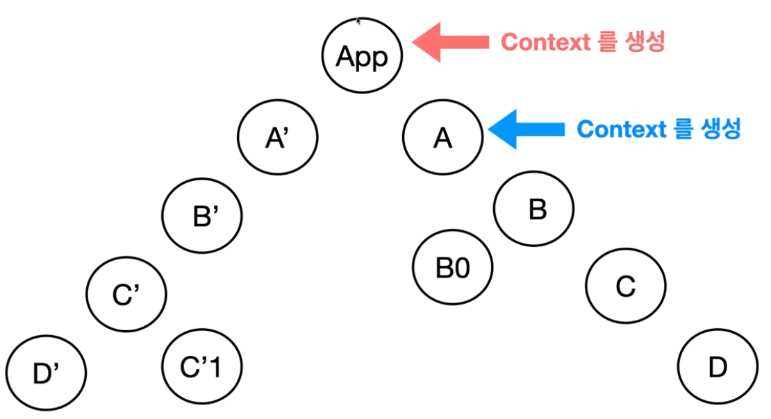 A 컴포넌트가 Context를 생성하게 되면 A 컴포넌트의 하위 요소들만 A 요소의 Context에 접근할 수 있고, 나머지 요소들은 접근할 수 없다.
