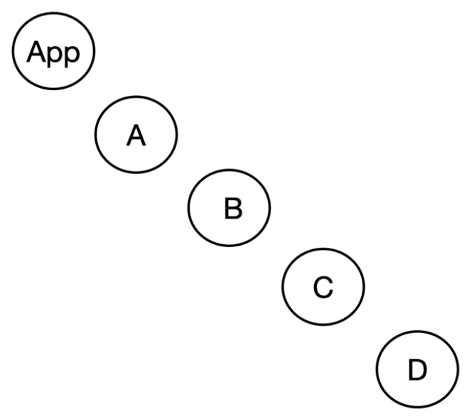 App이라는 최상위 컴포넌트가 있고 그 아래로 A, B, C, D 컴포넌트(children)가 있다.