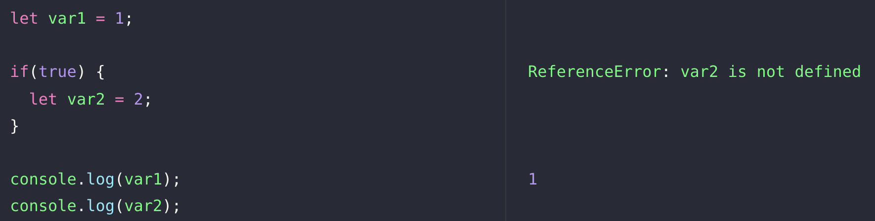 👉 var와 달리 let var2는 전역으로 선언되지 않았으므로 ReferenceError 출력