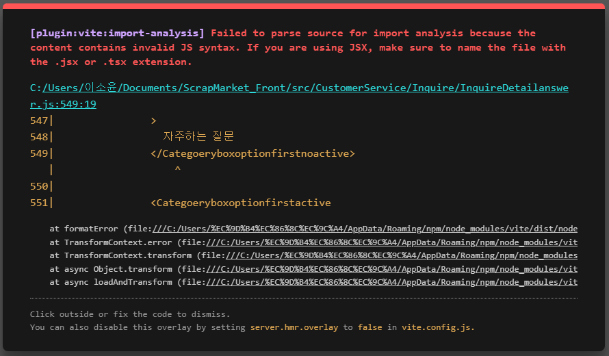 해당 오류가 발생하는 파일들의 이름을 .jsx 로 통일시켜주자 😄