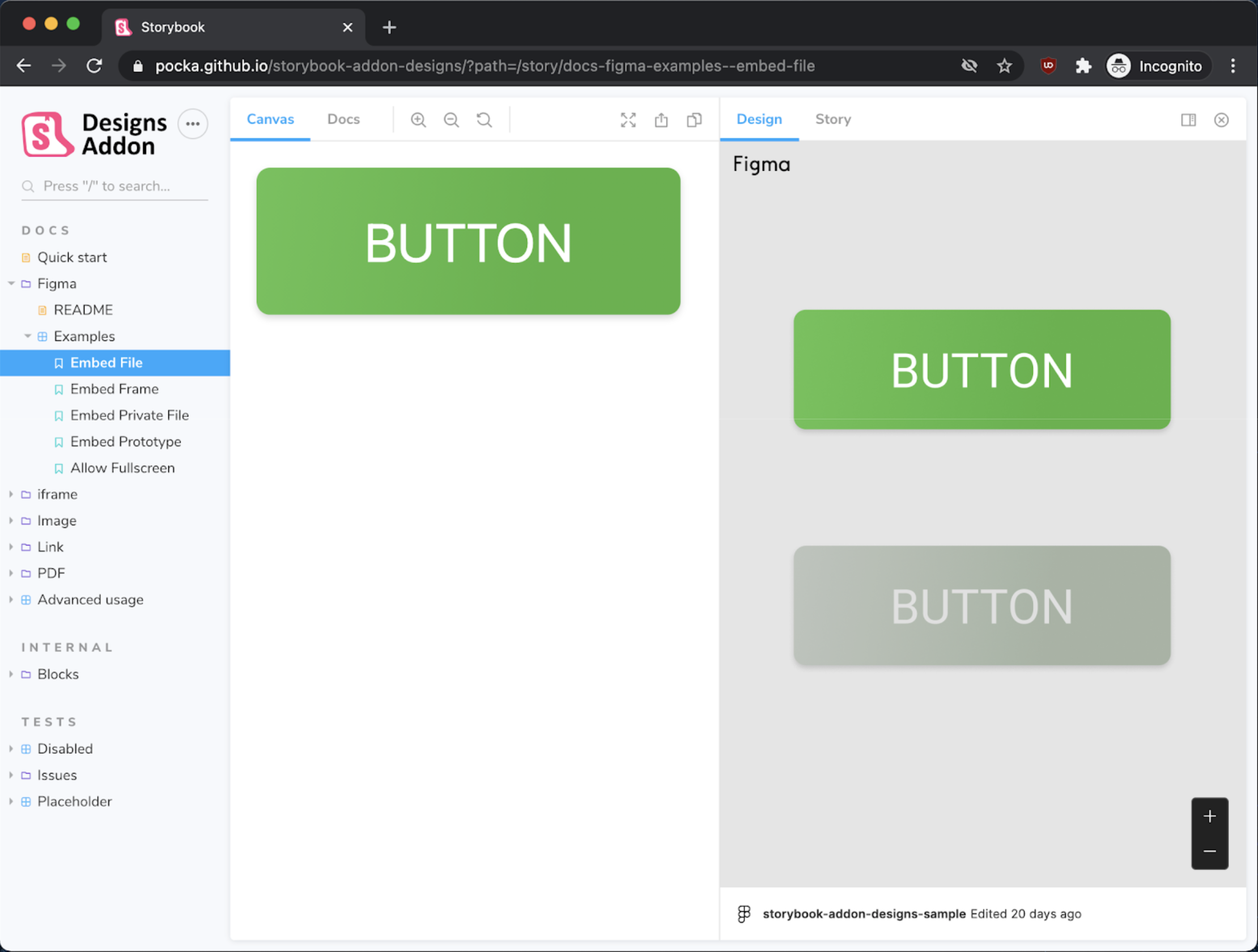 Storybook의 디자인 애드온은 Figma 파일과 프로토타입을 Storybook에 포함시킬 수 있도록 합니다. Figma Live Embeds로 구동됩니다. 공유 설정에 관계없이 Figma 파일을 Storybook에 포함시킬 수 있습니다. 팀 내에서 비공개 파일을 공유하거나 전 세계와 공개 파일을 공유할 수 있습니다.